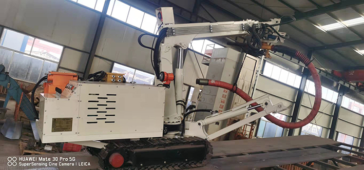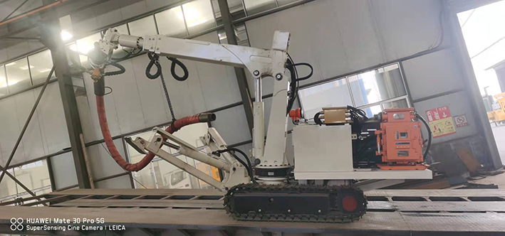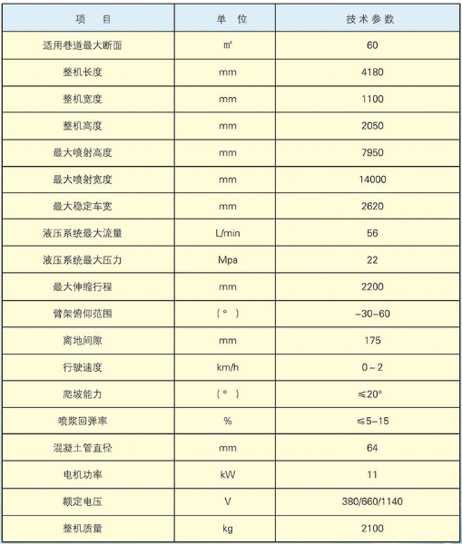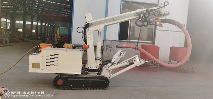 CPF-6OLY型礦用混凝土輔助噴射車(以下簡稱噴漿機(jī)械手)主要用于煤礦井下煤巷、半煤巷、全巖石掘進(jìn)巷道與混凝土噴射機(jī)配套使用,代替人工噴漿作業(yè),滿足噴漿工藝要求,整機(jī)小巧、靈活、耐用、適應(yīng)能力強(qiáng),可用于大型噴漿機(jī)組無法進(jìn)入的巷道,實現(xiàn)噴漿無線操作、機(jī)械化作業(yè),減輕人工噴射勞動強(qiáng)度大的問題。整機(jī)完全采用無線遙控操作、液壓控制,工作性能安全可靠。下車液壓系統(tǒng)負(fù)責(zé)行走、上車液壓系統(tǒng)負(fù)責(zé)噴射,上下車動作手動切換,防止誤操作。整機(jī)具有結(jié)構(gòu)穩(wěn)定可靠,動作平穩(wěn),噴射范圍大,自由度多,遙控操作靈活,噴射平整度好,回彈少,噴射效率高、施工質(zhì)量好,可實現(xiàn)遠(yuǎn)程控制,操作人員可位于在可視情況好、粉塵濃度少,較為安全的位置操作,保證使用人員安全。