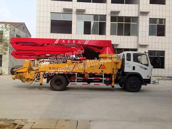 混凝土泵車是利用壓力將混凝土沿管道連續(xù)輸送的機(jī)械。由泵體和輸送管組成。按結(jié)構(gòu)形式分為活塞式、擠壓式、水壓隔膜式。泵體裝在汽車底盤上,再裝備可伸縮或屈折的布料桿,就組成泵車?;炷帘密嚨膭恿νㄟ^動力分動箱將發(fā)動機(jī)的動力傳送給液壓泵組或者后橋,液壓泵推動活塞帶動混凝土泵工作。然后利用泵車上的布料桿和輸送管,將混凝土輸送到一定的高度和距離。